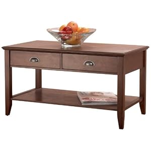 This Foremost coffee table is made of hardwood with wood veneer in warm walnut finish. The unit is made of light weight construction with honeycomb grid core. It comes with solid wood legs and two storage drawers with a bottom storage shelf. Assembly is required.